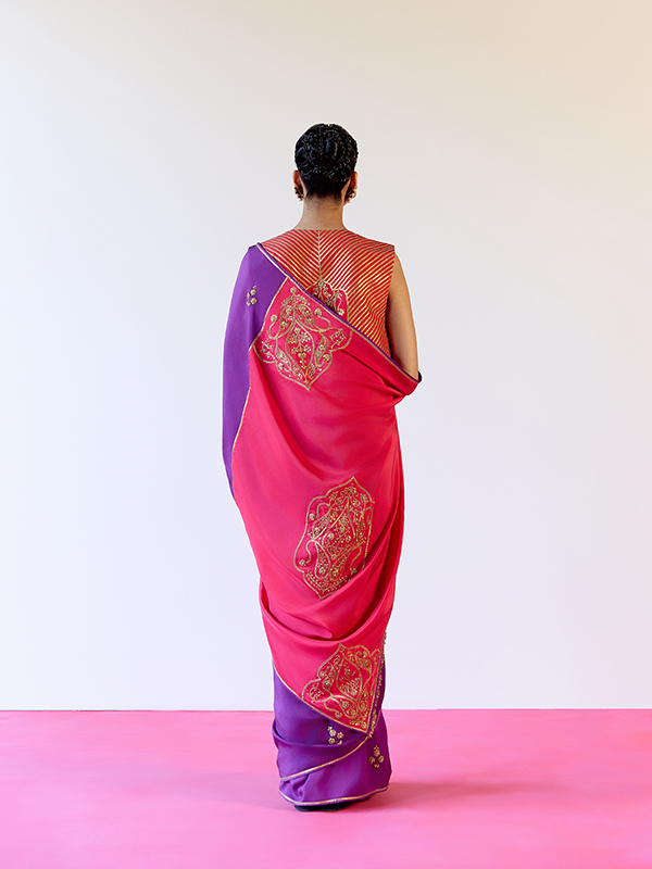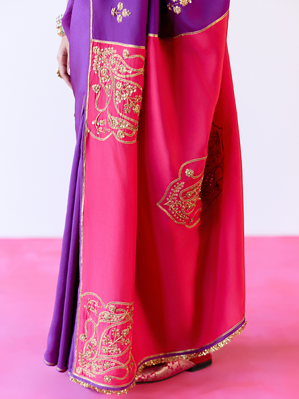 Meet the BHADRA Saree—a striking blend of purple and red, seamlessly joined to create a bold yet balanced contrast. Scattered butis add a soft festive sparkle across the drape, while the pallu stands out with finely embroidered gota motifs that bring traditional detail to focus. Finished with handmade tassels, BHADRA brings together rich colour, craftsmanship, and celebration—perfect for festive gatherings and special occasions.