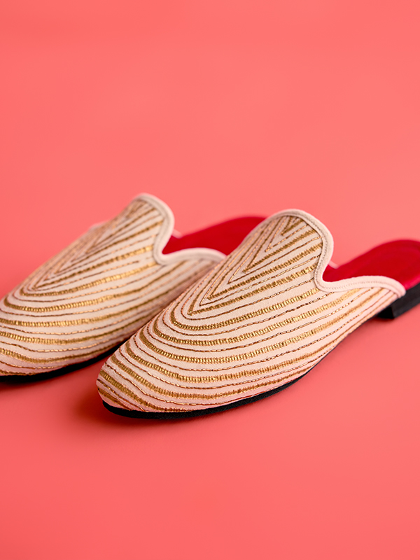 Inspired by the elegance of Rajasthan’s regal craft, the BUNDI Sliders are reimagined in soft suede and adorned with vintage gota embroidery. Formal yet effortless, they add a touch of understated shimmer — perfect for pairing with festive ensembles, occasion wear, or elevated evening dressing.