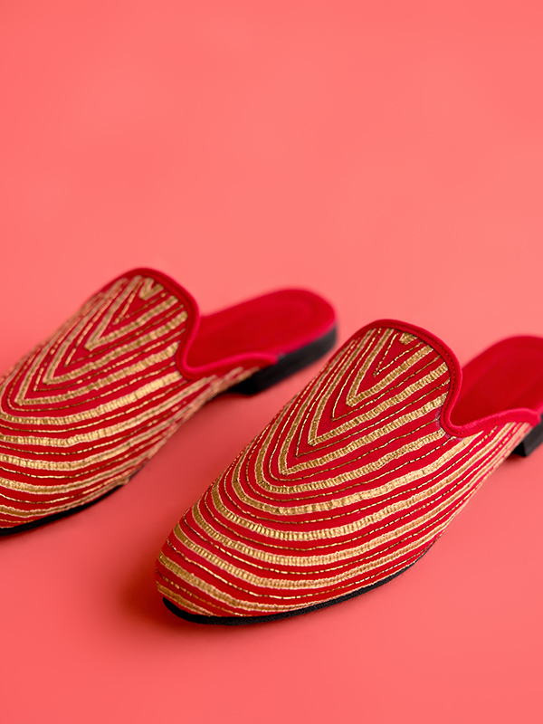 Inspired by the elegance of Rajasthan’s regal craft, the BUNDI Sliders are reimagined in soft suede and adorned with vintage gota embroidery. Formal yet effortless, they add a touch of understated shimmer — perfect for pairing with festive ensembles, occasion wear, or elevated evening dressing.