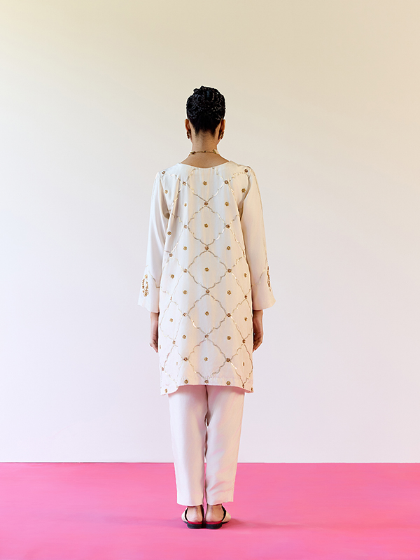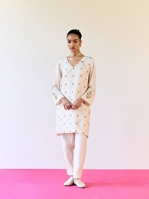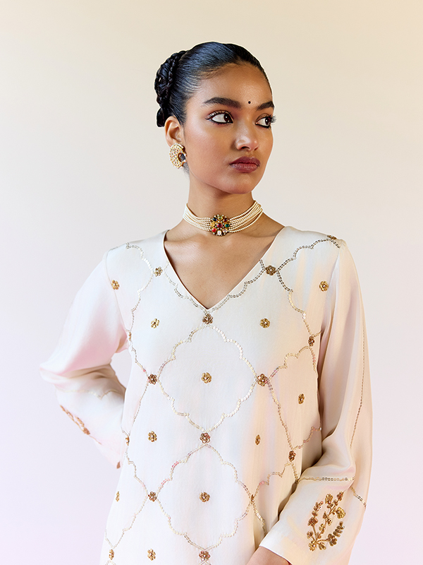 The Ecru Jhalore Tunic Set features an all-over sequinned motif tunic that catches the light with a soft, luminous finish. The sleeves are highlighted with fine gota and sequin embroidery motifs, adding artisanal intricacy and surface detail. It is paired with solid silk pants that anchor the look with a clean, elegant balance.