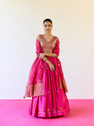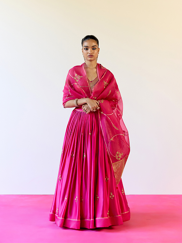 The Hot Pink Sikar Ghaghra Set features a ghaghra detailed with scattered hand-embroidered butis that add gentle shine across the surface. It is paired with a matching blouse embellished with sequins and gota embroidery, bringing depth, sparkle, and a coordinated finish to the ensemble. Completing the set is an organza dupatta embroidered with an all-over jhaal and finished with delicate gota work along the edges, adding lightness and subtle shimmer.