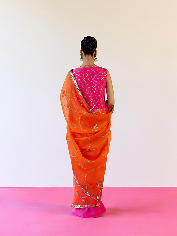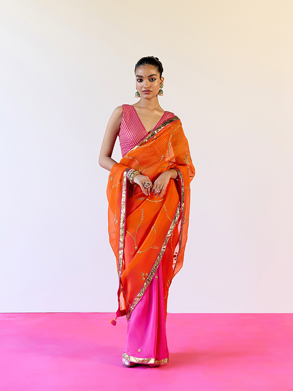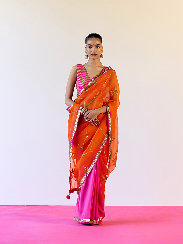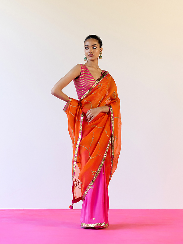 The KESARBAGH Saree features a beautiful combination of hot pink and orange, created by joining silk and organza fabrics. The drape is highlighted with all-over butis for a subtle sparkle, while the pallu is richly embellished with a detailed gota and zardozi jhaal. The saree is finished with a gold lampi gota border and handmade tassels, adding festive shine and artisanal detail.