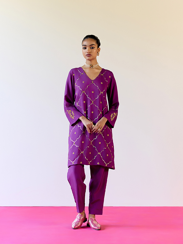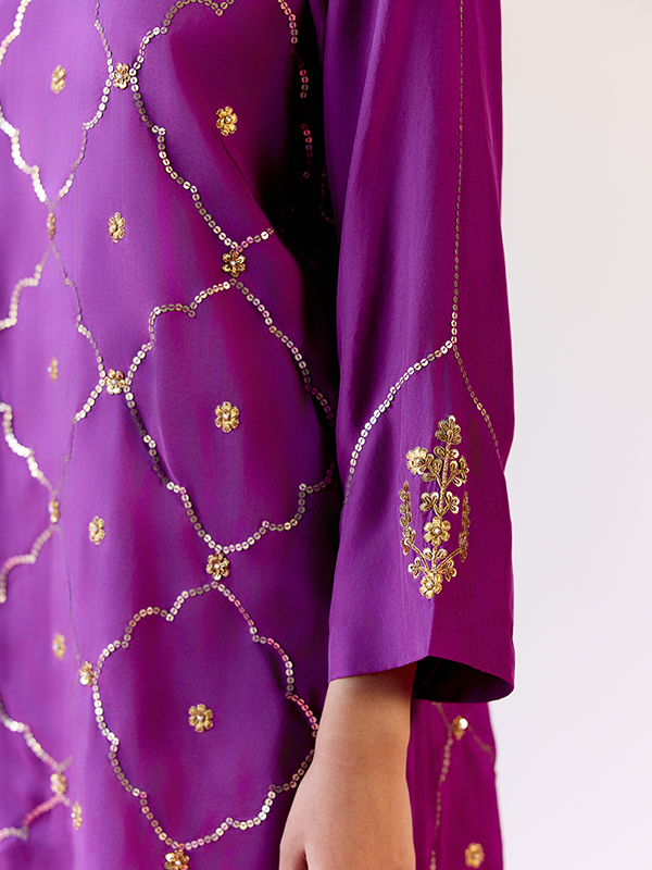The Purple Jhalore Tunic Set features an all-over sequinned motif tunic that catches the light with a soft, luminous finish. The sleeves are highlighted with fine gota and sequin embroidery motifs, adding artisanal intricacy and surface detail. It is paired with solid silk pants that anchor the look with a clean, elegant balance.