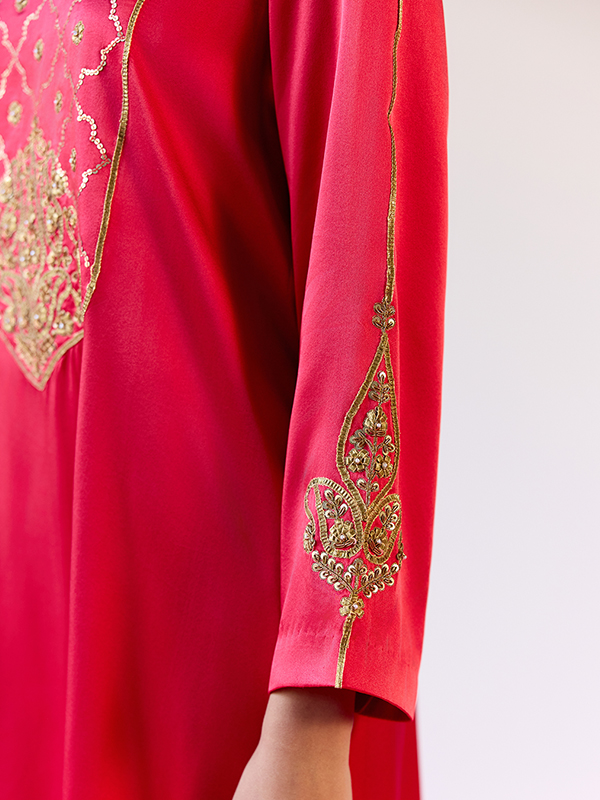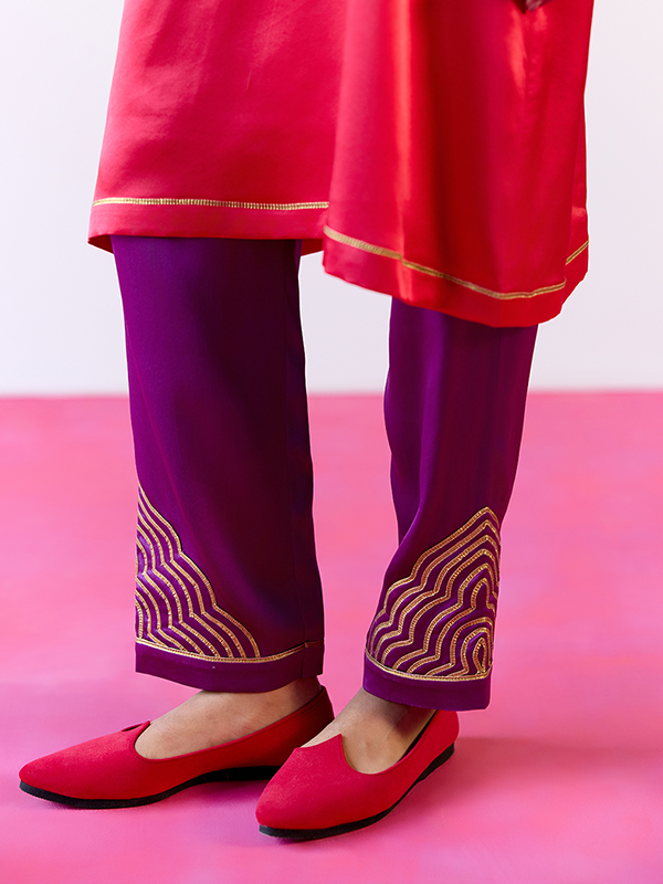 The Balera Tunic Set is crafted in silk and finished with an intricately embellished yoke, brought alive through vintage gota embroidery that lends depth, gleam, and surface richness. The sleeves are accented with finely embroidered motifs, adding a quiet layer of detailing. Paired with contrasting pants edged in understated gota, the set offers refined balance in colour and craft.
