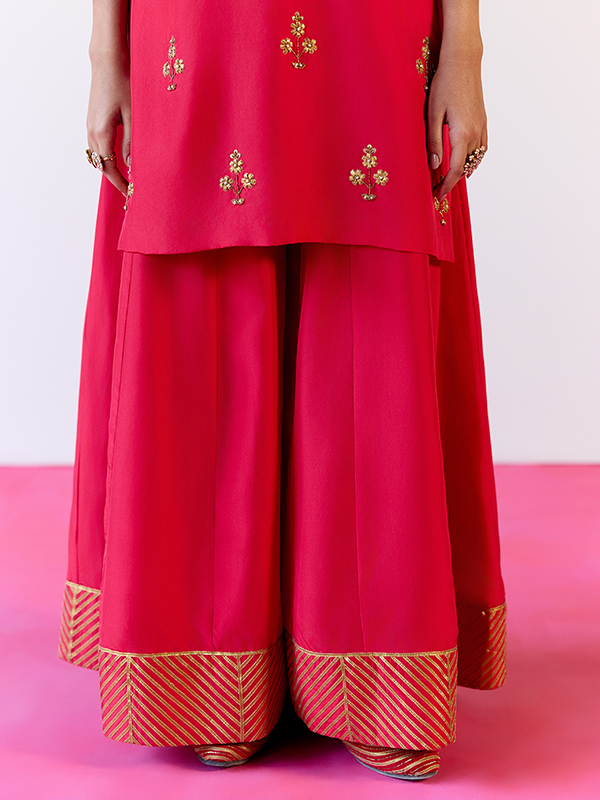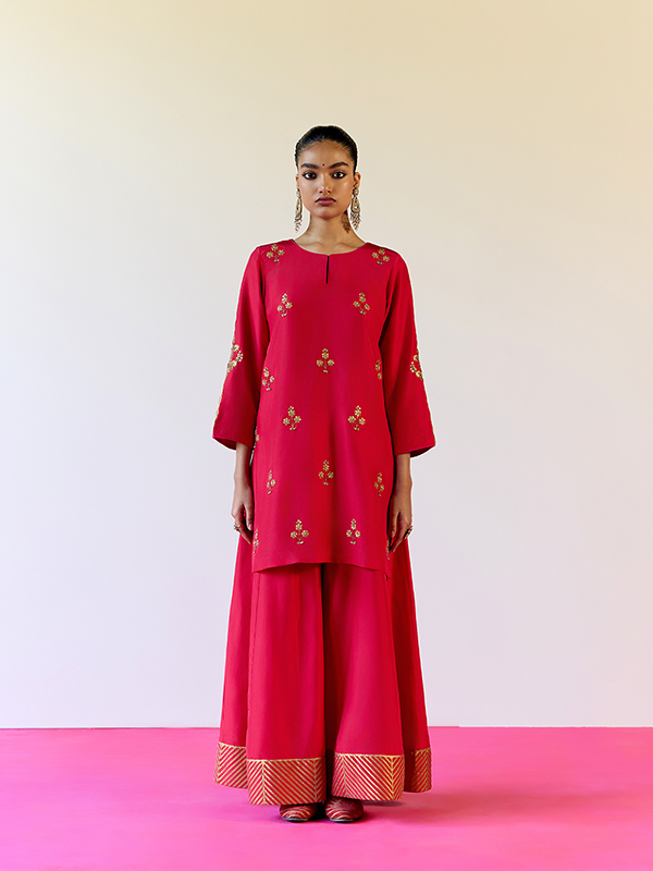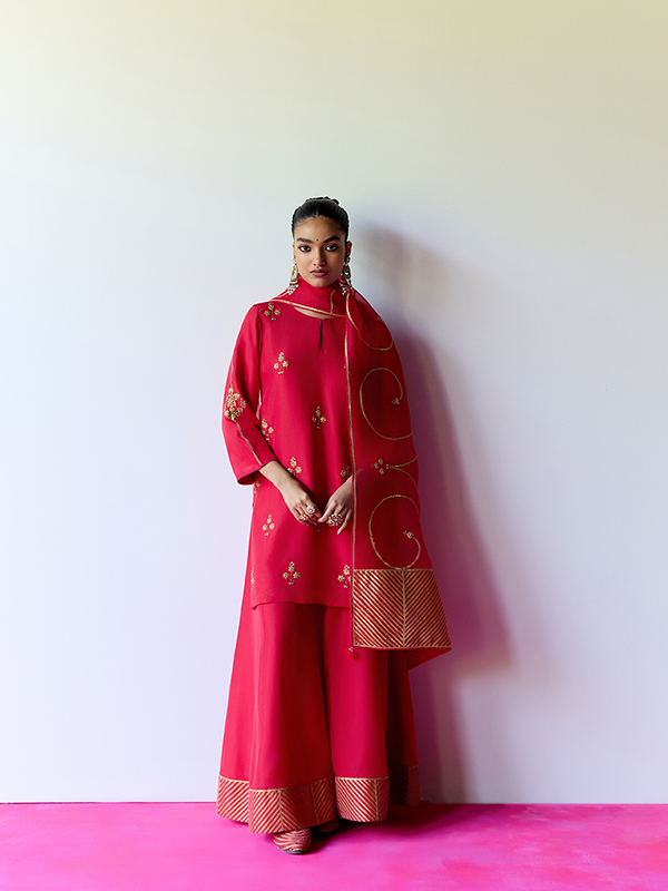 The BAORI Sharara Set features a kurta adorned with scattered hand-embroidered butis that lend soft sparkle and refined texture across the surface. It is paired with a wide-leg sharara finished with chevron-style gota edging, adding a crafted layer of detail to the silhouette. The organza dupatta is richly embroidered with an all-over jhaal and framed with a handcrafted gota border, bringing a luminous, artisanal finish to the ensemble.