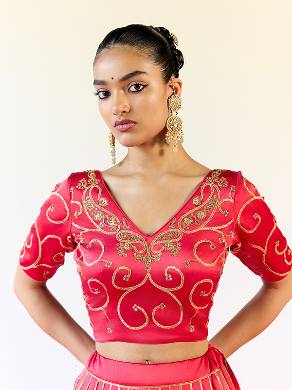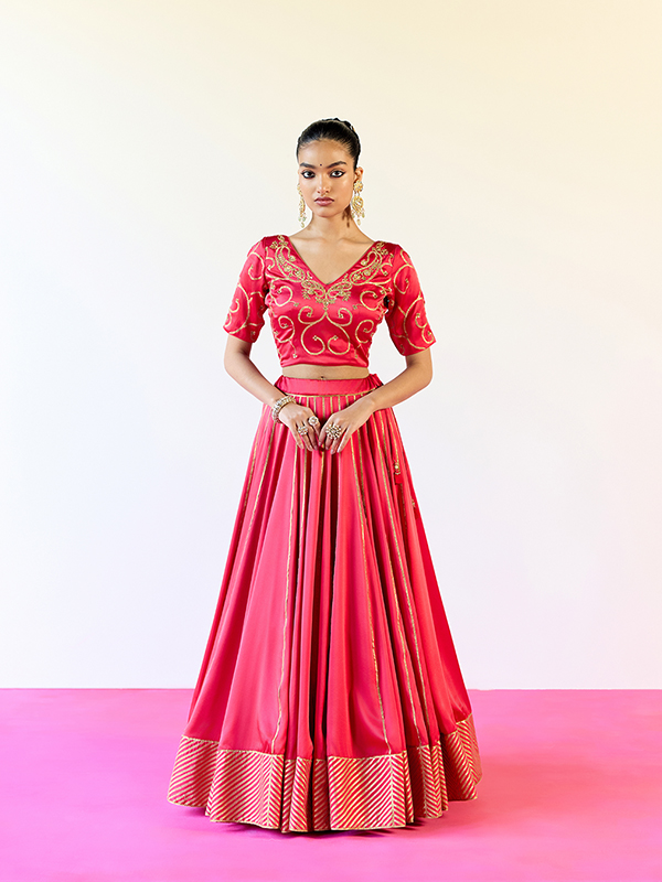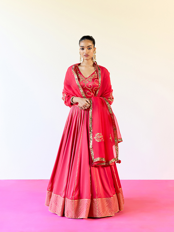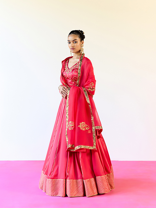 Opulent in detail yet delicately balanced, the Red Sirohi Ghaghra Set embodies handcrafted luxury designed for your most special celebrations.