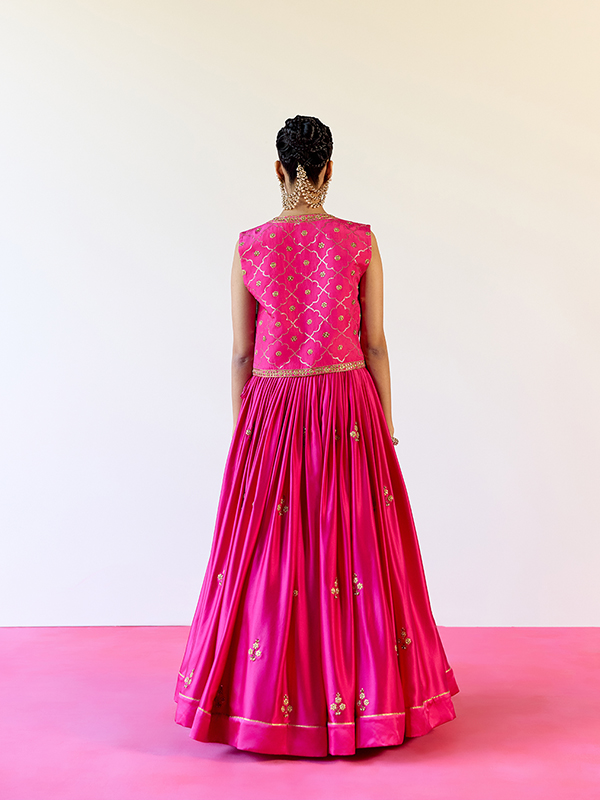 The Hot Pink Sikar Ghaghra brings a refined expression of festive elegance with delicate hand-embroidered butis scattered all over, lending a soft, luminous texture to the silhouette. It is paired with the Jawahar Koti, fully adorned in fine sequins embroidery that adds a subtle brilliance and a polished finish to the ensemble.